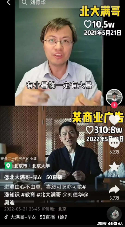 当晚,短视频博主“北大满哥”发文质疑该文案抄袭他在去年小满节气发布的一条视频文案,两者在文字编排上几乎一模一样。事情迅速发酵,至5月22日,多个相关话题登上热搜。